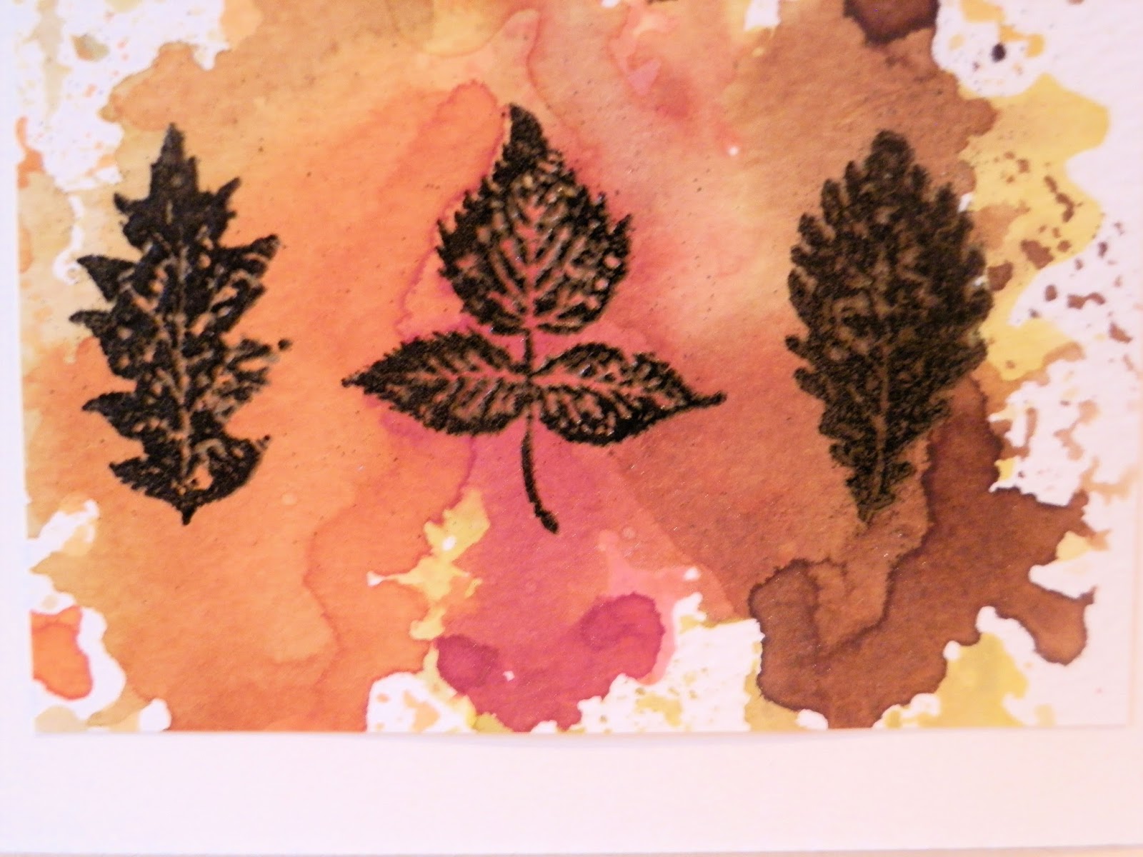 Next up is a card from Day 2 I really like how the background came out but don't love how I stamped the leaves. The one cool thing is I learned a new trick, I orginally embossed in black and found it too harsh so re-stamped with versamark and added gold embossing powder on top. While I don't love the effect on this particlar card, I will definitely do it again.